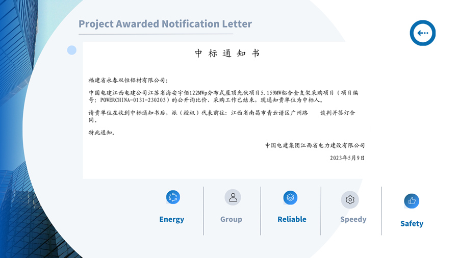 Nous sommes ravis d'annoncer que Kinsend (Shuangheng Aluminum) a remporté de nouveaux projets. Power China Jiangxi Electric Power Construction Co., Ltd. a annoncé que Kinsend (Shuangheng Aluminium) avait été attribué en tant qu'autorisateur final pour l' achat de support en aluminium de 5,159 MW pour le projet solaire photovoltaïque distribué sur le toit de 120 MW .