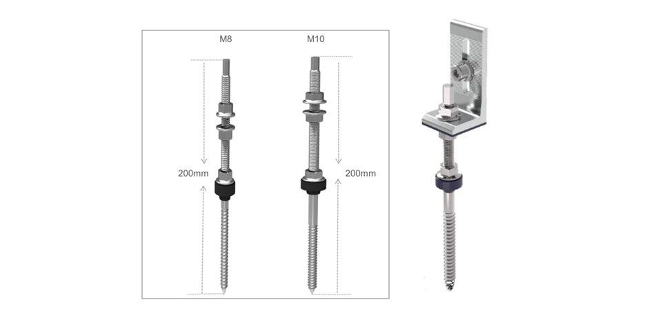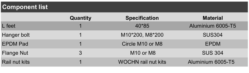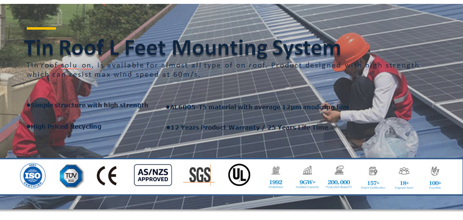 Supports de pieds en L principalement appliqués aux toits en tôle trapézoïdale et en tôle ondulée . Il peut être directement fixé sur la poutre du toit avec une vis. Le boulon de suspension et la vis St6.3x80  s'appliquent à l'installation sur  une poutre en acier et une poutre en bois. Rendant l'installation plus rapide, compétitive et fiable. Les systèmes sont entièrement conformes aux normes internationales sur la charge de vent et de neige.