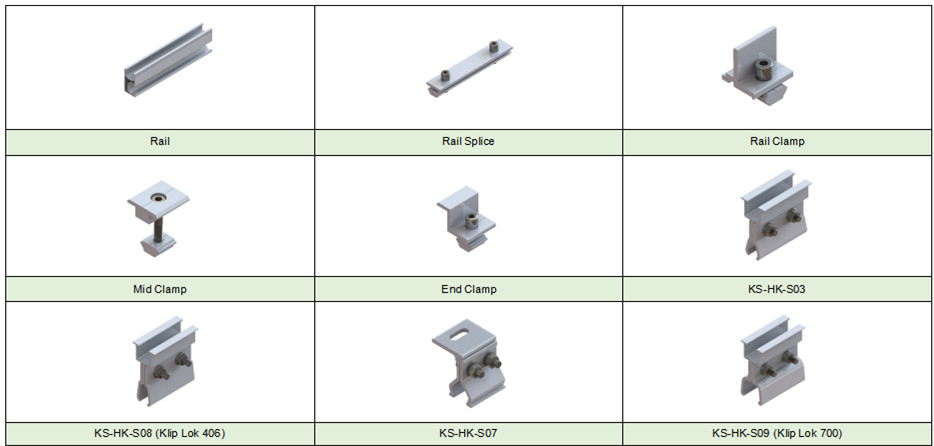 kinsend's le nouvel ECO SYSTEM est un système plus léger et facile à installer. fixez le cliplock 406 sur la plaque métallique du toit et serrez les boulons. fixez le rail ECO sur le cliplock 406 avec une vis hexagonale. PV modules sur le rail écologique avec pinces médianes et pinces d'extrémité.