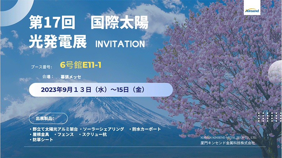 Kinsend vous invite à vous rencontrer lors de la prochaine exposition au Japon, du 13 au 15 septembre 2023. Lors de cette exposition, nous présenterons plusieurs solutions de conception. Système de montage au sol , système de montage sur le toit, système de montage étanche , affichage de plusieurs modèles d' accessoires d'installation solaire . Les codes QR suivants peuvent être disponibles sur les billets d'exposition.